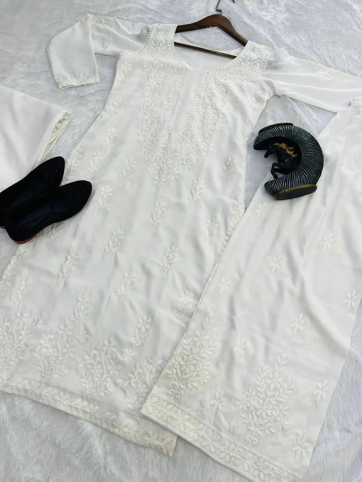 Premium White Maslin Embroidered Kurti Set with Palazzo & Dupatta