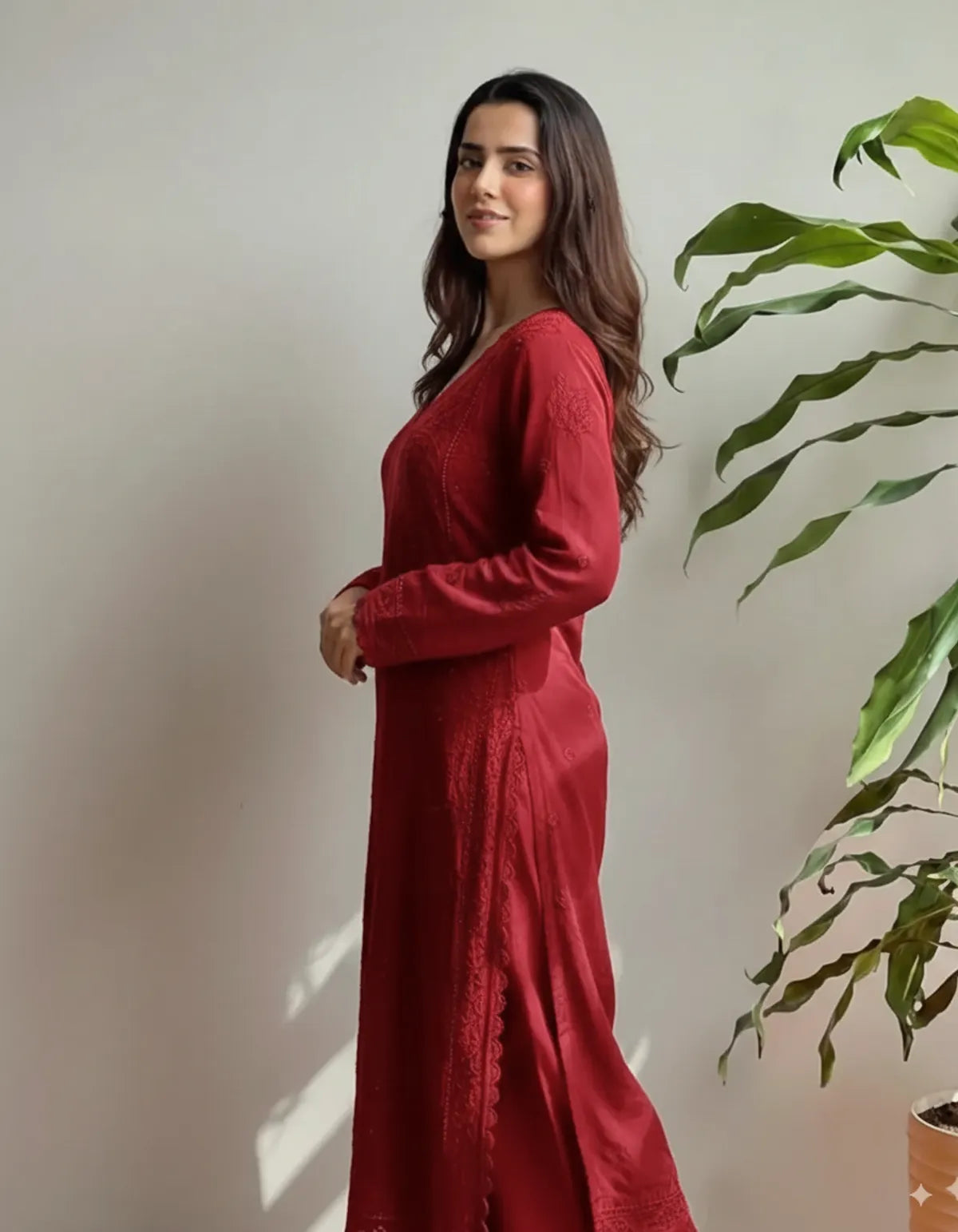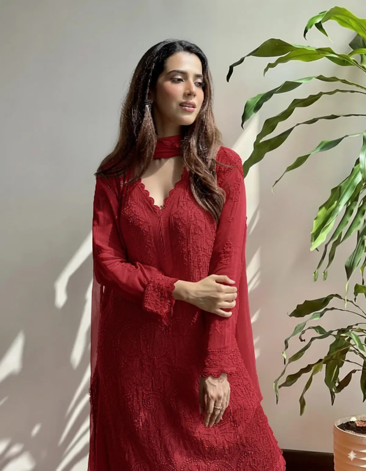 Red Cotton Bloom Embroidery Chikankari Kurti Plazzo with Dupatta Set