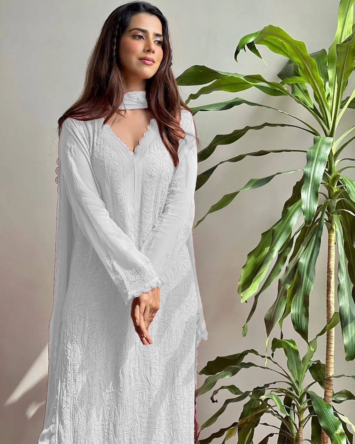 Premium White Maslin Embroidered Kurti Set with Palazzo & Dupatta