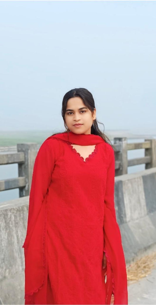 Red Cotton Bloom Embroidery Chikankari Kurti Plazzo with Dupatta Set